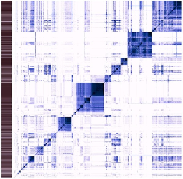 Classic heatmap visualization of the enzyme reaction mechanism clustering project I am working on (see Science things#Enzyme clustering for details). This visualizes a distance matrix of all the tested enzymes. So, on the x axis, each column is an enzyme, and on the y axis each row. Each line corresponds to a comparison of the enzyme in that line with all the other enzymes. The diagonal of this square compares the enzyme with itself. The more similar two enzymes are, the darker the dot.