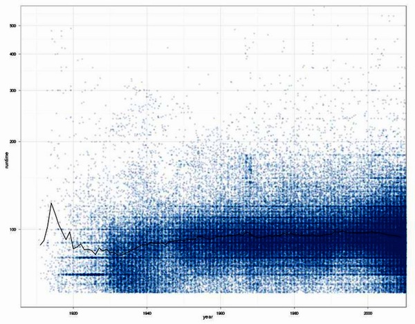 Using IMDb data about movie runtimes munged with Perl and analyzed with R (statistical software)