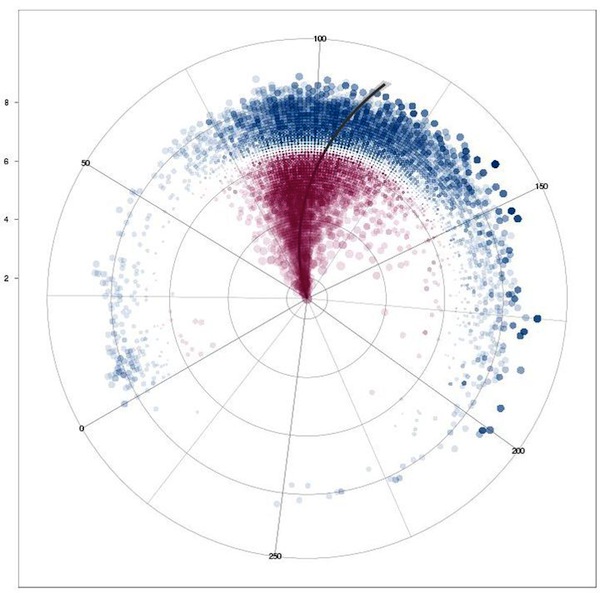 Correlation of movie runtimes and IMDb rating over the decades. Blue dots for movies with ratings above the global median (6.48 of 10), red dots for ratings below with increasing alpha values in both directions. Decades are shown in concentric circles with the 2000s in the outer circle. This is quite handy, since the number of movies increased almost exponentially and outer circles have more space to spread out.